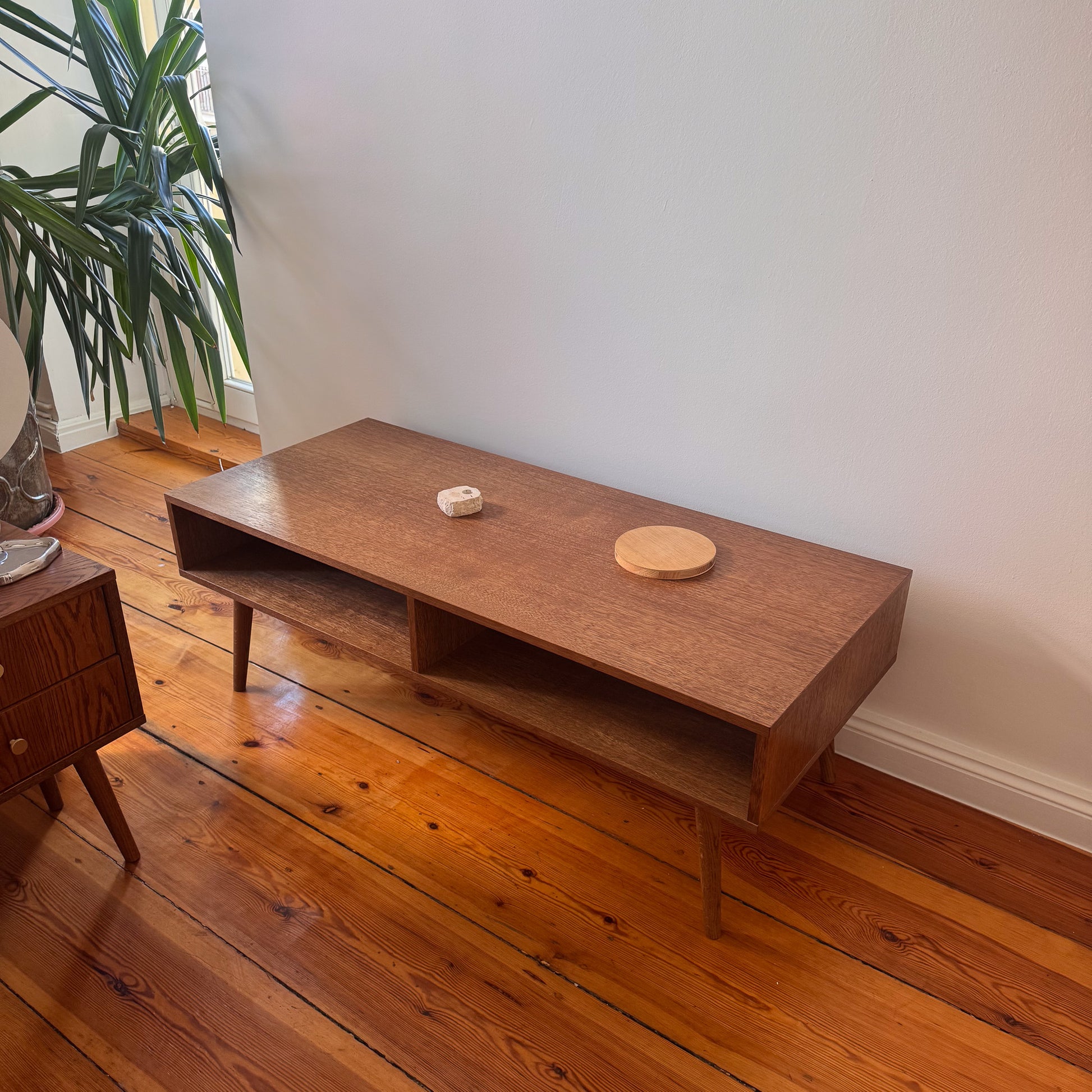 Der Couchtisch PAST bereichert jedes Interieur mit seiner schlichten, minimalistischen Form und seiner praktischen, zweigeteilten Ablagefläche. Das Möbelstück ist mit hochwertigem Eichenfurnier veredelt, gebeizt und abschließend sorgfältig lackiert, was ihm sowohl eine elegante Optik als auch besondere Langlebigkeit verleiht. Ein zeitloses Design, das Funktionalität und Stil harmonisch verbindet.
