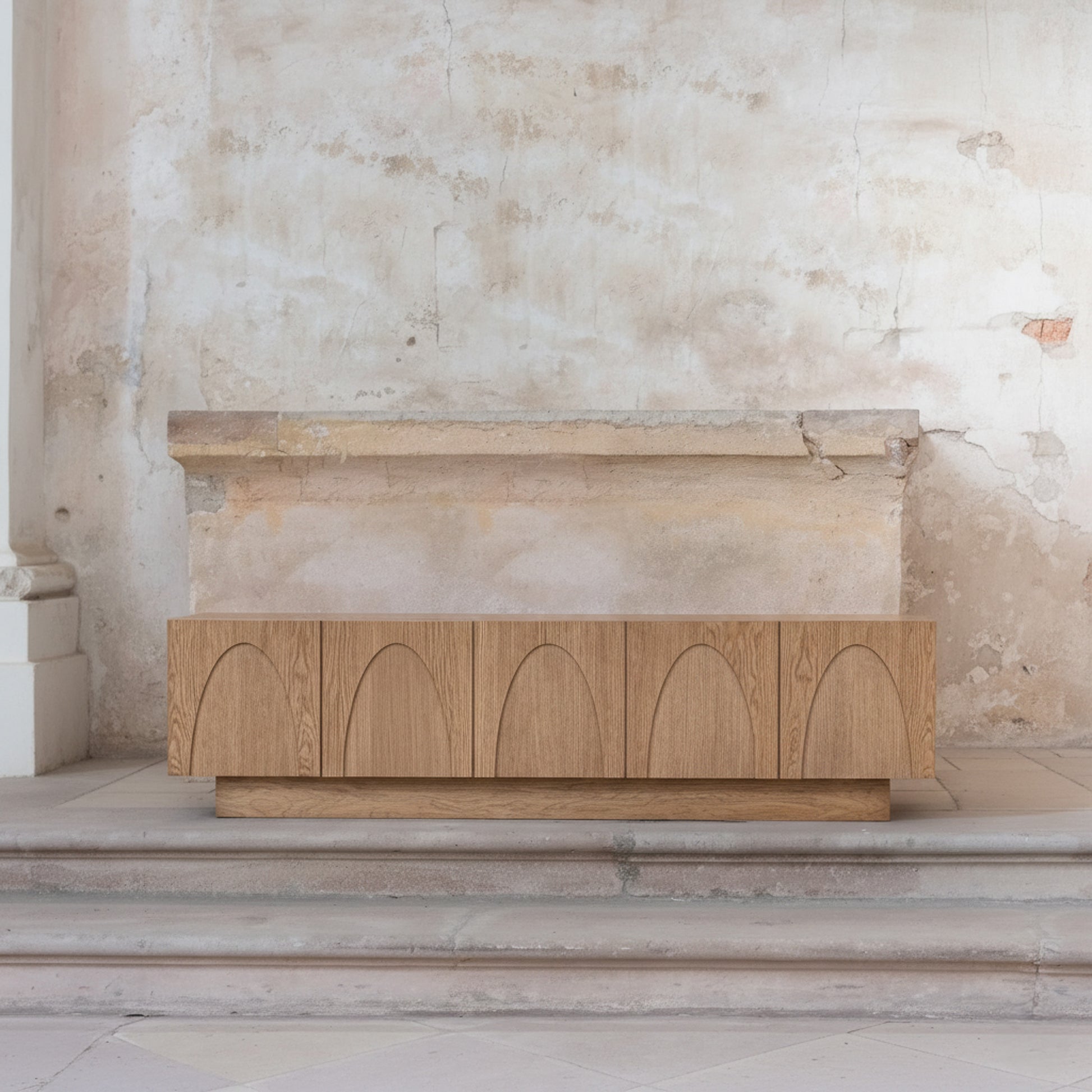 Die Kommode BROK zieht durch ihre sanft gewölbte Form alle Blicke auf sich, wobei Licht und Schatten spielerisch über ihre Fronten gleiten. Der schlichte, doch ausdrucksstarke Rhythmus macht sie zum natürlichen Ruhepol in jedem Raum. Auf einem niedrigen Sockel ruhend, verbindet sie Stabilität mit Eleganz, während der warme Holzton für eine gemütliche Atmosphäre sorgt. Ideal für Räume, in denen reduziertes Design auf entspannte Stille trifft.