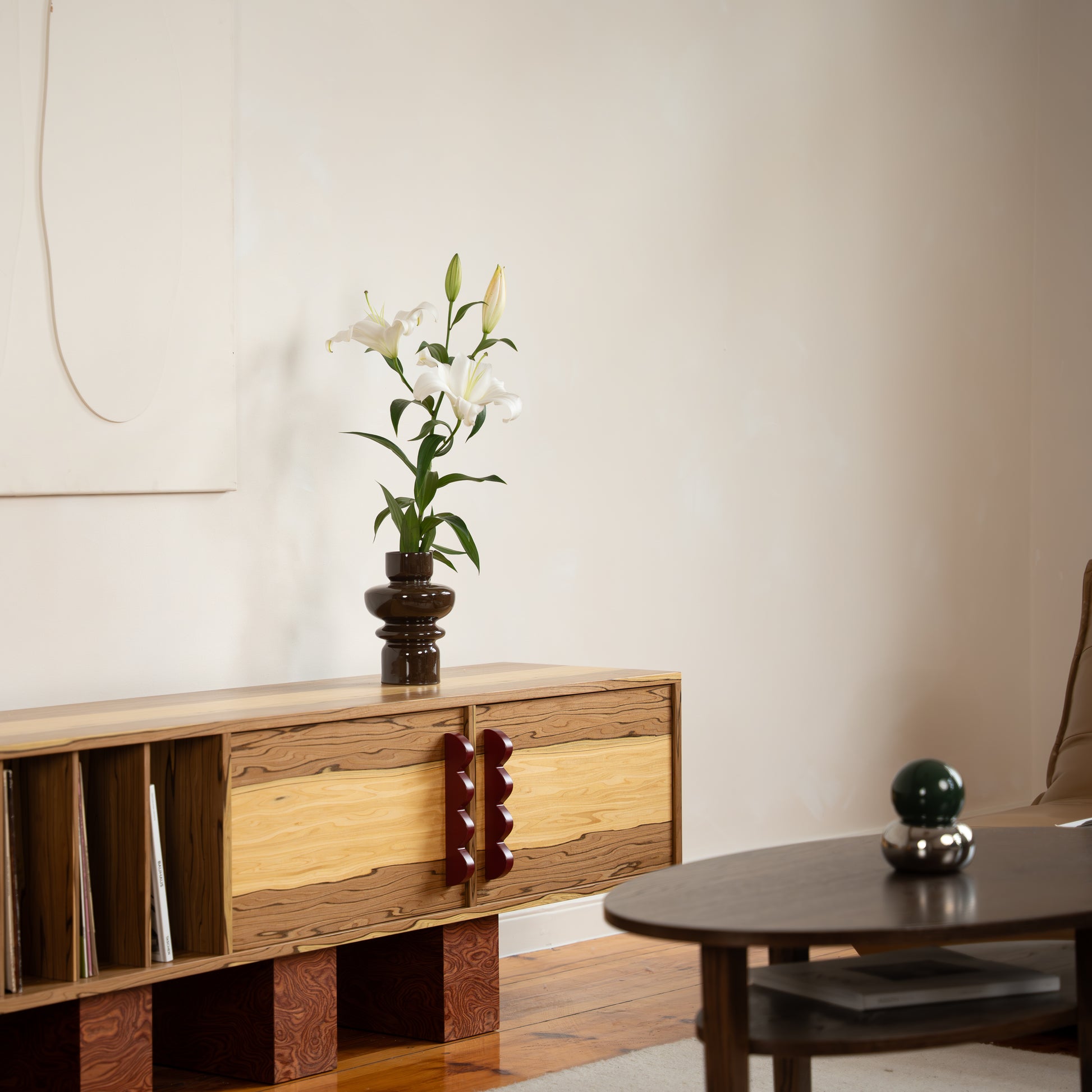 Das TV-Möbel NAMI LONG TV ist die perfekte Wahl für Vinyl-Liebhaber und Freunde guten Designs. Geräumige Fächer für Schallplatten, offene Regale und praktische Kabeldurchführungen sorgen für höchste Funktionalität. Ein minimalistisches Möbelstück mit Charakter – geschaffen, um im Mittelpunkt zu stehen.