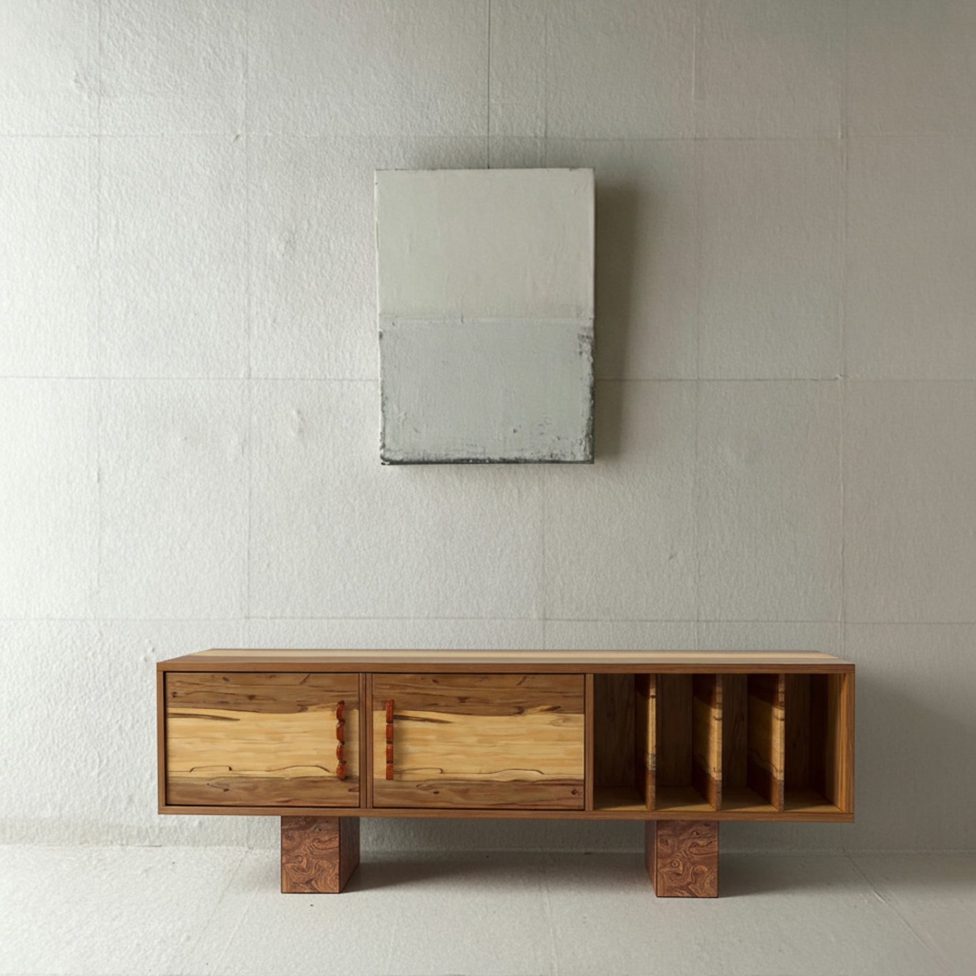 Die offenen, vertikalen Fächer eignen sich ideal zur Aufbewahrung von Schallplatten, Büchern oder Dekoration, während das geschlossene Fach Ordnung schafft – ohne auf Stil zu verzichten. Getragen von breiten, blockartigen Beinen verleiht NAMI jedem Raum Struktur, Wärme und handwerkliche Authentizität.