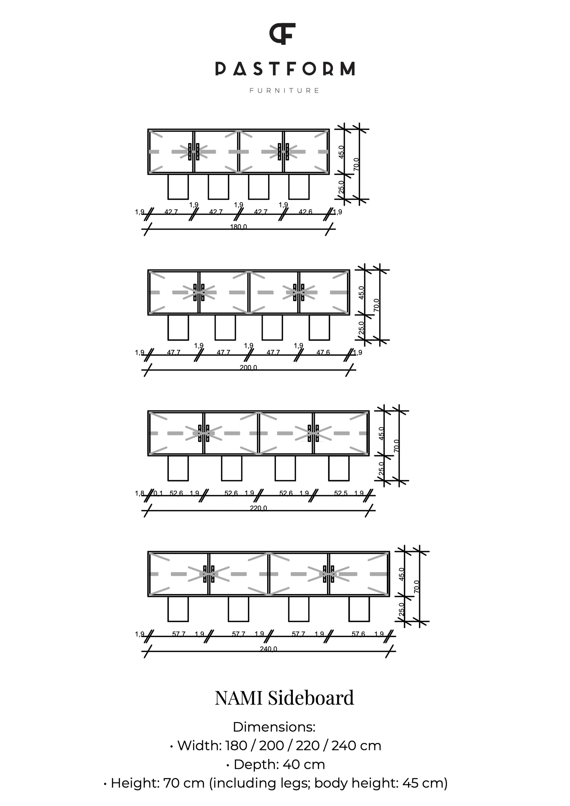 Komoda NAMI spojuje čisté linie s odvážnými, sochařskými nohami a mění úložný prostor ve výrazný prvek interiéru. Rytmické dřevěné čelní plochy, zdobené charakteristickými kulatými úchyty, zdůrazňují přirozenou krásu dýhy a řemeslného zpracování. Za každými dvířky se nacházejí výškově nastavitelné a vyjímatelné police, které nabízejí naprostou volnost při uspořádání vnitřního prostoru – rovnováha mezi funkčností a designem.