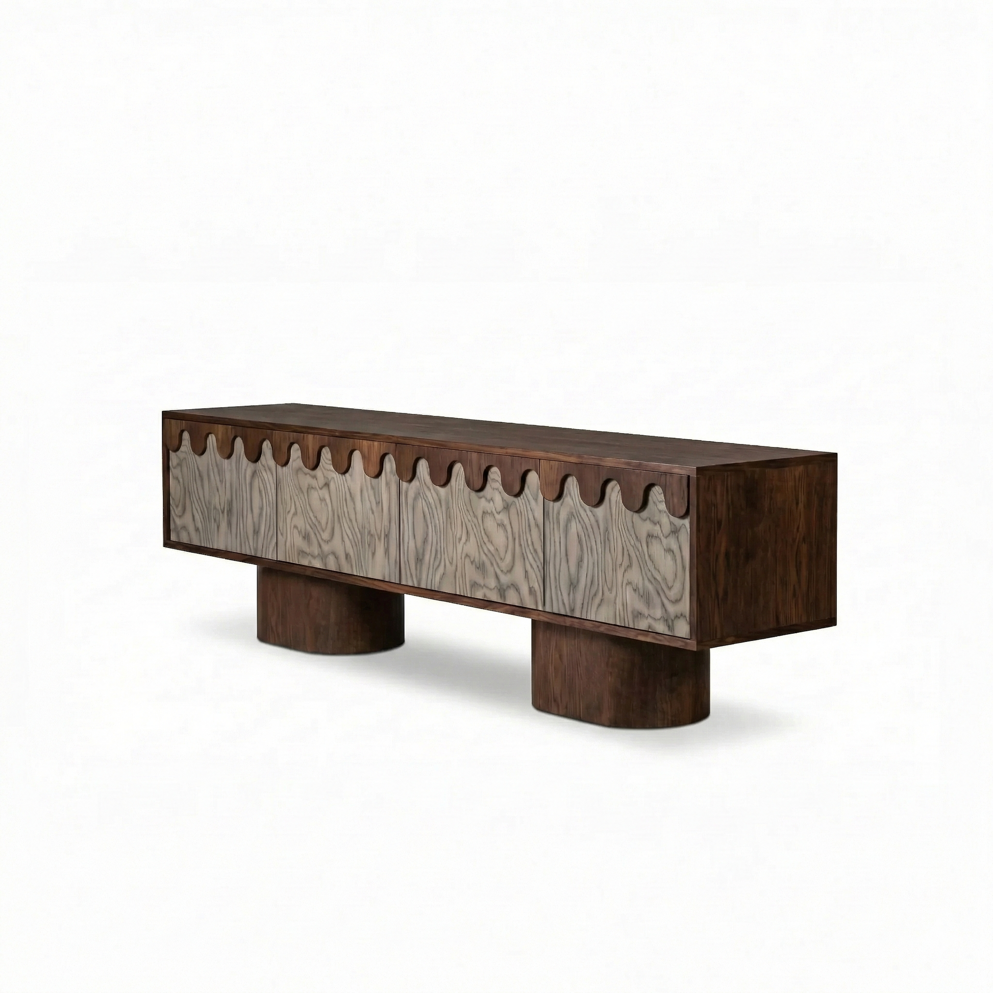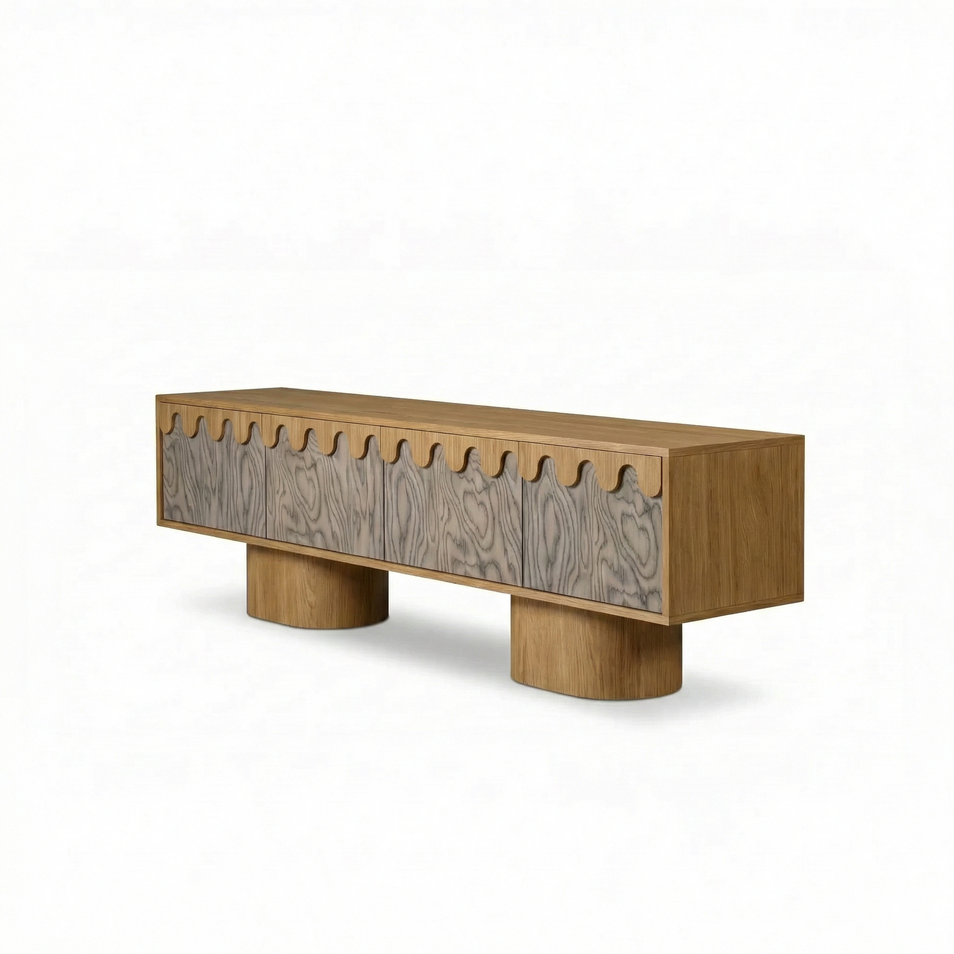 Das MERROW Sideboard ist ein Designer-Holzsideboard, das skulpturale Form mit Alltagstauglichkeit verbindet. Inspiriert vom Mid-Century-Modern-Stil besticht es durch eine klare horizontale Silhouette und ein charakteristisches, wellenförmiges Frontdetail.