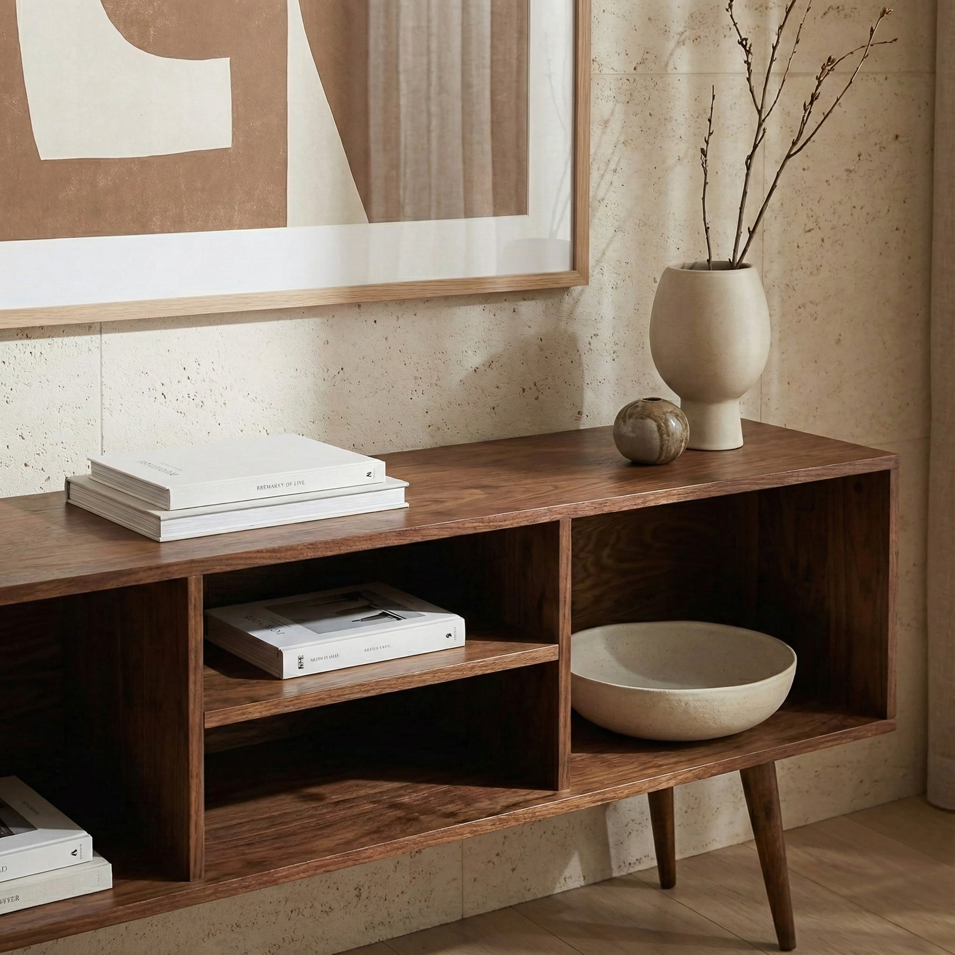 Minimalistische Form, maximale Offenheit. Das TV-Möbel OPEN schafft Raum – sowohl im wörtlichen als auch im übertragenen Sinne. Ohne Griffe, ohne Türen, dafür mit viel Platz für alles, was Sie griffbereit haben möchten. Perfekt geeignet als Stellplatz für den Fernseher, aber auch als offenes Regal für Bücher oder Sammlerstücke. Unaufdringlicher Stil mit charmantem Retro-Akzent.